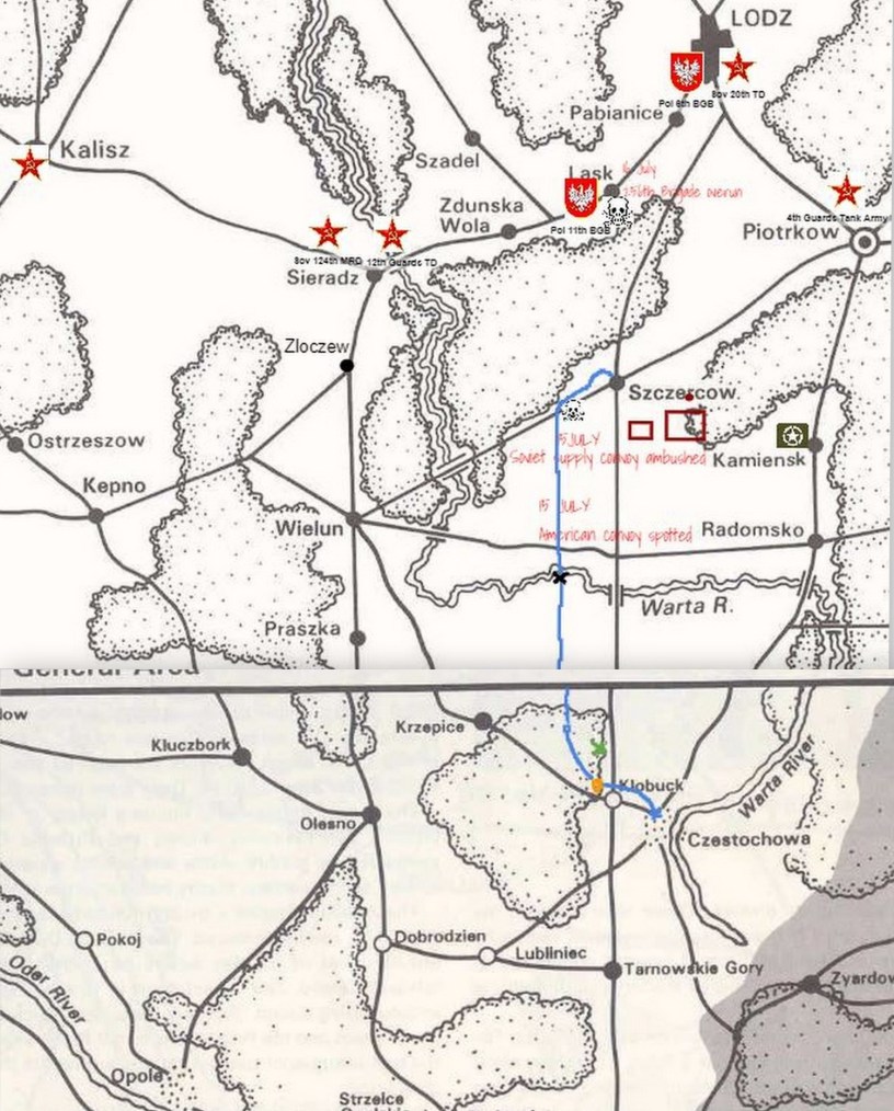 The travel was surprisingly uneventful. Apparently the region is crawling with marauders from the mutinied Soviet 9th Tank Division, but no bandits were encountered. The party swam their two amphibious vehicles across the Warta River at the site of somebody’s riverside marijuana farm, and continued south until the forest between Krzepice and Kłobuck, where they camped until morning.