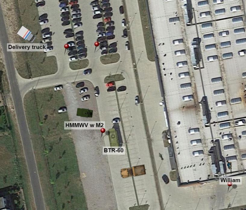 William saw the marauder’s HMMWV driving for the building, but he had no way to communicate it. The Humvee crashed into the bay door, and continued through to the factory floor. Several soldiers in American uniforms followed.