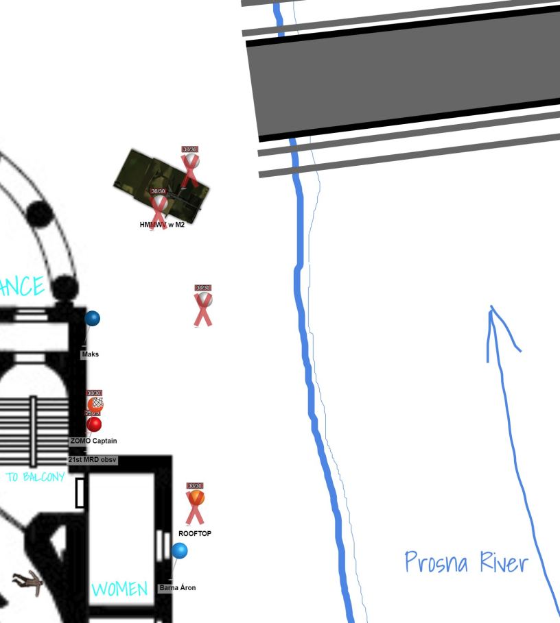 Instead, they’d have to make their way across the pedestrian bridge just to the north. GDW reported that one of the Polish army Humvees had pulled up to the front of the theater, and that the soldiers were taking positions, preparing to enter the building. One was making his way around the side of the building, and might see them soon.
