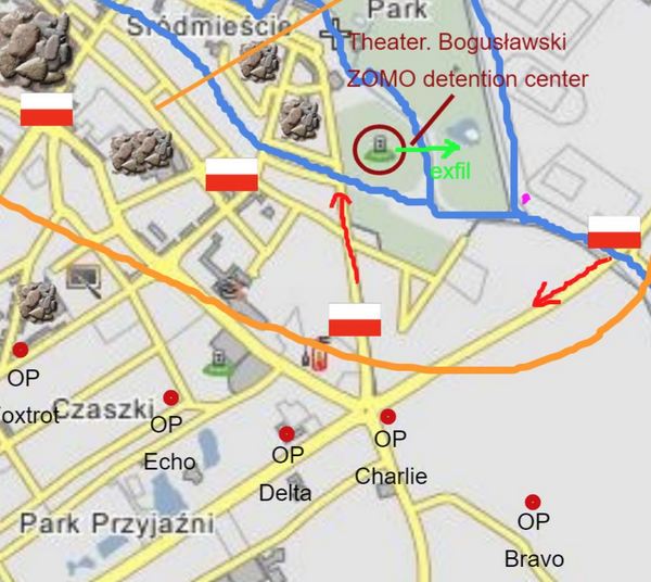 Maks’ insertion team at the ZOMO detention center at the east end of the city core had drawn too much attention, and the situation was getting out of hand. More reinforcements kept trickling in. They needed to escape from Kalisz – [cough] – but hadn’t been able to break free yet.