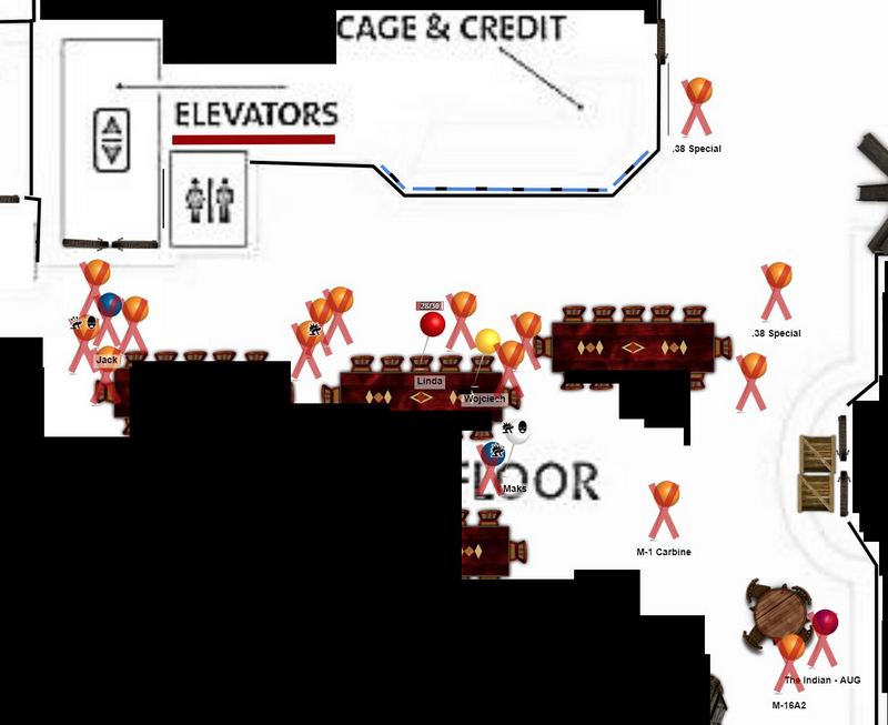 One of The Indian’s lieutenants shows up, along with a gunman (and the Indian too! but he is hidden for the moment). The sub-boss makes his Observation roll, takes shots at Wojciech, which instead impact against the bank of slot machines.