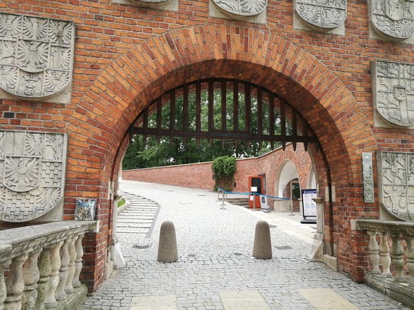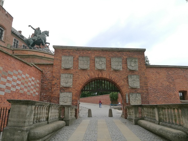 Wawel Main Gate. To the left there is a statue of Tadeusz Kosciuszko.