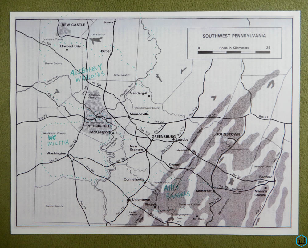 A particularly talented and dangerous marauder leader, known only as “White Death”, had stitched together a confederation of gangs known as the Allegheny Warlords. The Warlords held sway over vast numbers of refugees scratching a living from the ruins of Pittsburgh and its suburbs.